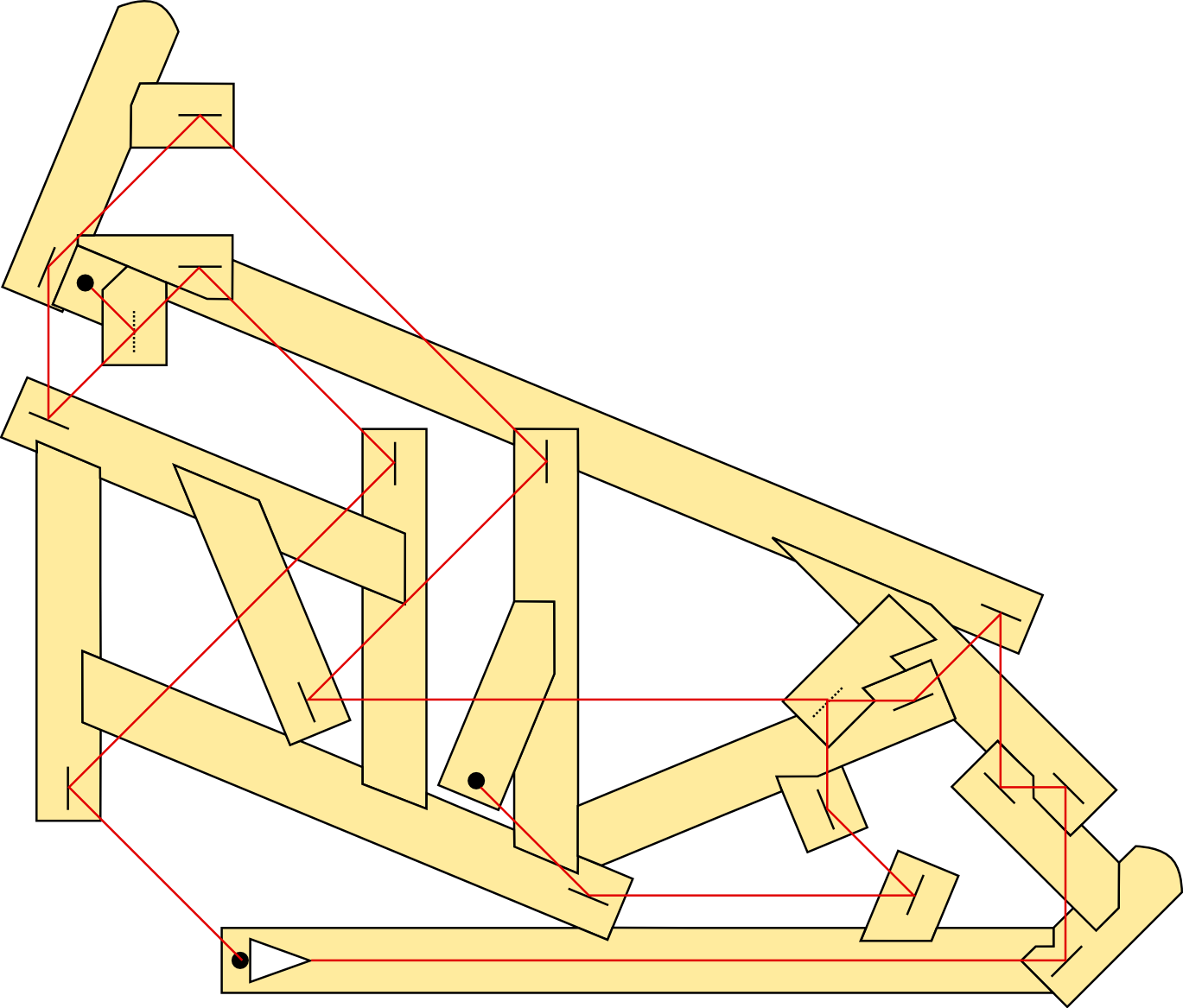 CiSRA Puzzle Competition 2009 - SolutionsThis is the archive of the 2009 Puzzle Competition. Please visit the current competition site for information about the latest Puzzle Competition. C.2 CoherencyFirst, assemble the pieces. None of the pieces overlap any other, and all of the oddly shaped notches are filled by other pieces. The result looks like this: The information we haven't used yet is the triangle shape, the short solid and dashed lines, and the black dots. The triangle is a laser beam emitter, the short black lines on each piece are mirrors, the dashed lines are half-silvered mirrors (which light can reflect off and also pass through), and the black dots absorb the laser. Drawing on the laser light in red gives: The laser traces the distinctive shape of a SWAN.