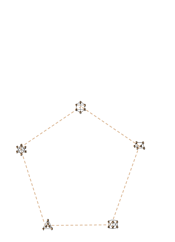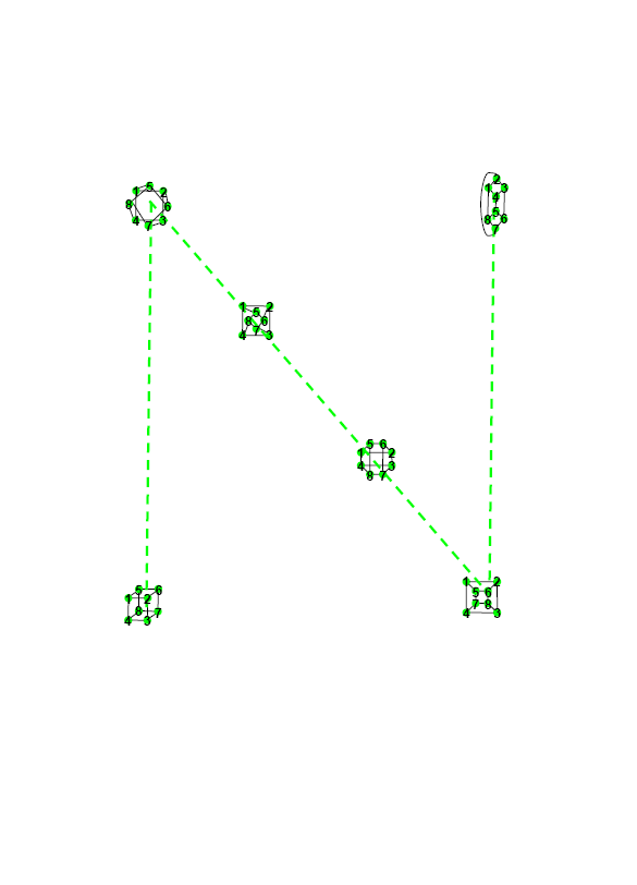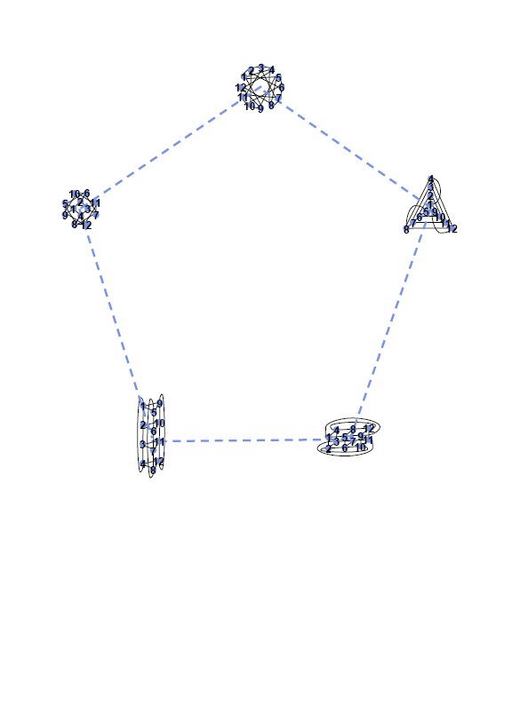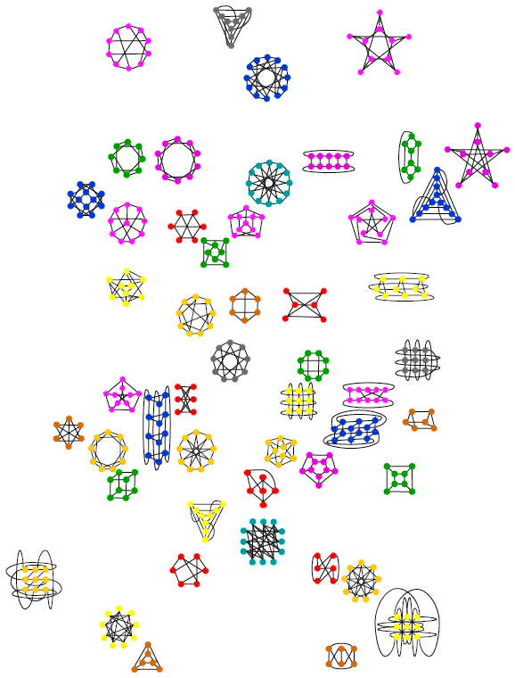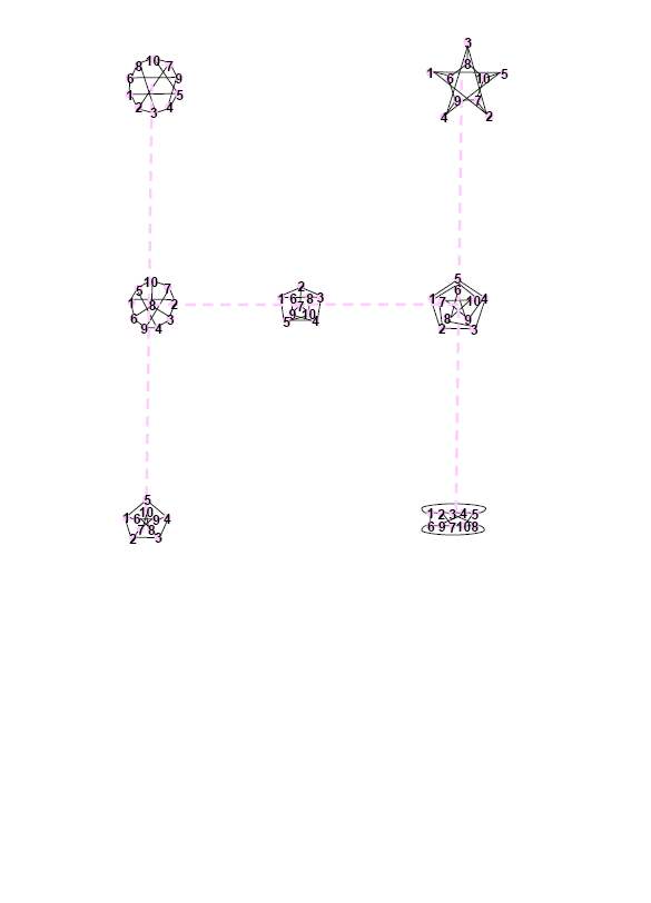 CiSRA Puzzle Competition 2010 - Solutions2D. The Lay of the StarsThis puzzle contains a collection of symmetric graphs, with 6 to 12 nodes and 3 or 4 edges at each node. In fact, they're all regular graphs, meaning they have the same number of edges connecting to each node. Many of the graphs in this puzzle are isomorphic to each other, meaning that they are mathematically the same graph, but arranged differently. i.e. They can be stretched into the same shape without breaking any of the edges. Working out exactly which graphs are isomorphic is a difficult step, as there are graphs which have the same number of nodes and edges but are not isomorphic to one another. The sets of isomorphic graphs are shown in the diagram below, identified by colour. Each set of isomorphic graphs forms a letter. The images below show this, with dashed lines added to show the letters they form. In each of the graphs, the nodes are numbered to show how they map to one another isomorphically (click to get the large versions to see this). The graphs and the letters they produce are: