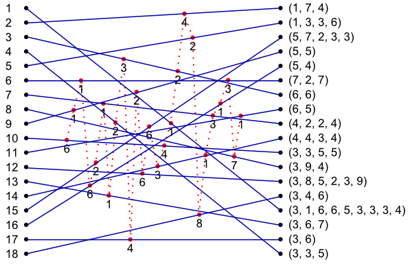 The word lengths of each answer matches one of the list of parenthesised numbers on the right hand side of the diagram, but not in the same order as the questions. If a straight line is drawn between each question and the word lengths of its answer, each line crosses one or more red dots.
