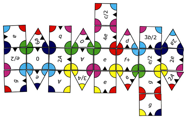 CISRA Puzzle Competition 2011 - Solutions2A. Squares and TrianglesThe puzzle presents 18 squares and 8 triangles; each piece has brightly coloured corners, a few characters written on it, and in most cases a small black triangle on one edge. The characters seem (in most cases) to be a letter from "a" to "g" (or "A"), in many cases multiplied by some fraction. There are some exceptions: "f+", "0", "3/4". The fact that only letters in that range are used suggests a possible connection to musical notes, and the multipliers used could well indicate note lengths. Viewed in this light, the exceptions also make sense: "f+" could indicate f-sharp, "0" a rest, and the letterless "3/4" might be a time signature. "A" might represent a note an octave higher than "a". Of course, this is all well as a theory, but without a way to order the notes the chance to find a solution is limited. So we must find some way to arrange the squares and triangles. The coloured corners are provocative. It seems natural to try and match them - to place two pieces adjoining along an edge so that on each corner, the colours from each piece are the same. A little experimentation shows that every edge has a match in this way, although some edges do have more than one candidate. Experimentation shows that not all of the pieces can be matched up - if you stick to two dimensions. This may lead to the realisation that every edge can actually be matched up simultaneously, provided we move to the third dimension. A bit of work with scissors and tape can enable the construction of a (small) rhombicuboctahedron out of the pieces, in such a way that every vertex is coloured with a single colour. Here is the net of the resulting solid, laid out flat: