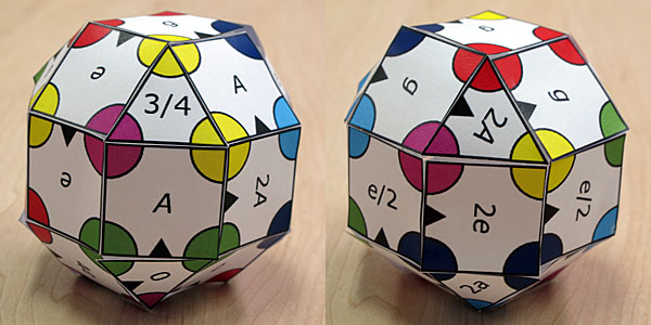 Once this assembly has been performed, the small black triangles can be seen to define a path around the object, starting with the triangle labelled "2a" and ending in one of the squares labelled with "e". When tracing this path, note that the triangles indicate the direction of entry to a face, not a direction of exit. The path defined leads to the following sequence of letters: 2a, a, e/2, 2e, e/2, 3b/2, c/2, b, 6a, 0, e, g, 2A, g, e, f+, d, 4e, 0, A, 2A, A, g, e, e One face is not visited in the path - the one labelled with "3/4". This may confirm the idea that this represents a time signature rather than a musical note. When the corresponding notes are read off and played, a familiar ear will identify the tune as the traditional ballad SCARBOROUGH FAIR, which is the answer. Puzzle design notes (no pun intended): I wanted to make something that would visually recall the horror of my puzzle "5D: 3d" from last year, but not be anywhere near as difficult to solve. Naturally I gravitated towards assembling three-dimensional solids from coloured pieces. I settled on the shape early, then had to find a mechanic to fit it. I decided that each face could be made to represent a musical note and a path traced along the faces could make a tune. I built several of the solids and started tracing paths, only giving up when I realised it was impossible to reach every face of the rhombicuboctahedron in a continuous path (and when my hands were stained with nk of three different colours) - there would always be one triangle left over. Then I hit on the idea of using the unvisited triangle to give the time signature. I know that time signatures are never written in music as fractions (with a stroke separating the two numbers), but I wanted to maintain the illusion that the puzzle might be an algebra problem and not simply give away the fact that the letters represented musical notes. From there, the major job was to colour the vertices in such a way that it would be possible, but not trivial, to match them up to form the solid. I began with four colours, but quickly realised that repetition led to unresolvable ambiguities in the edge matching. So I went up to five colours, and ran into a similar problem. It might have been made to work with five colours, but I ran out of patience with rearranging the colouring after numerous test solves in which I hit brick walls of ambiguity. Six colours took a bit more rearranging, but I finally got it to work. The one remaining problem that bugged me was that Scarborough Fair (I settled on the tune fairly early - deciding a timeless ballad would be a fairer test of musical recognition than some more modern and ephemeral tune) has tied notes that cross bar lines (the "6a" and "4e", held for 6 beats and 4 beats respectively). I knew that these are represented in musical notation as separate notes in different bars, and then tied, rather than single long notes that extend across bars. But I didn't want to separate the "6a" into "3a" and "3a", because that would give the impression of being two notes rather than a single long one. So I defied musical convention (again) and just went with a single note representation.