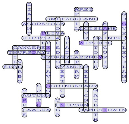 CISRA Puzzle Competition 2011 - Solutions4B. Double JeopardyThe first step to completing this puzzle is to solve all of the clues and fill out the crossword. Again. Each clue actually has two answers. For example, the clue "Superman's girlfriend (4,4)" yields the obvious answers "Lana Lang" and "Lois Lane". Since the given crossword already contains the answer "Lana Lang", the new version of the crossword must contain the alternate answer "Lois Lane". The full list of answers is here: