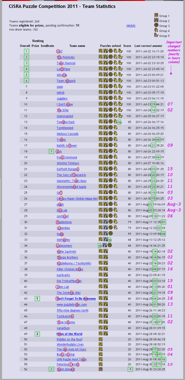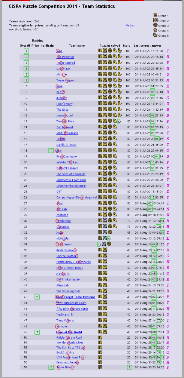 Puzzle design notes:Only names of real teams already registered in the 2011 CiSRA Puzzle Competition were used in the construction of this puzzle. I tried to give preference to teams who had solved puzzles in the actual competition, at the time I made the puzzle. I also tried to use team names that I had seen before in our competition in previous years, but of course I was constrained by the puzzle itself so I couldn't accommodate all the team names I wanted to use. Apologies to all for the fake scores I used. This puzzle was part of the 2011 competition's Group 4 set of puzzles, which we informally called "Mess With Their Heads Day". In 2010, the Group 4 puzzles consisted of the same puzzle graphic for each puzzle, just with different puzzle names. This year we decided to theme the day around giving the impression the puzzles were not really puzzles. Double Jeopardy, for example, was presented as a solution, while Puzzle Competition Reminder looked like an email we had accidentally sent and A Typical Puzzle seemed to be a gripe about mechanics often used in puzzles. Team Statistics was themed to look like the score board after the competition had finished. This placed a lot of constraints on the puzzle's construction, and produced a lot of information, not all of which could be fully consumed. The design task was to: