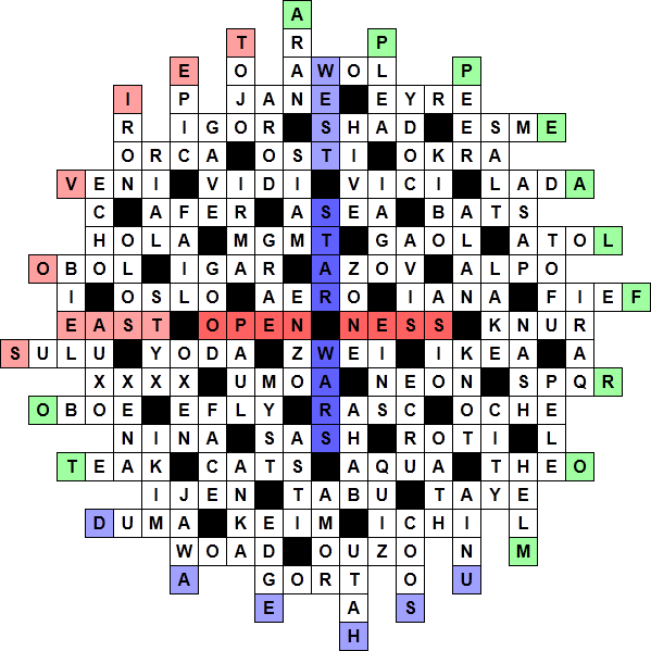 CISRA Puzzle Competition 2011 - Solutions5D. Four-Letter WordsThe first step is to solve the clues. From the grid and the puzzle title, the answers are expected to be (or consist of) four-letter words. After finding some of the obvious answers, it becomes apparent that the clues have been arranged so that the answers are in alphabetical order. This helps resolve several clues that might otherwise be ambiguous. An additional hint is given by the instruction below the grid: Words in multi-word answers appear consecutively in the grid. This implies that some of the answers contain more than one word (presumably all four letters). Likely candidates include Charlotte Brontë's heroine "Jane Eyre", Caesar's statement "Veni vidi vici", Utah's capital "Salt Lake City", the House episode "Epic Fail", Treehouse of Horror VI guest star "Paul Anka", and the Madonna lyric "gave good face" from Vogue. The list of the intended answers is: AERO, AFER, AHAB, AINU, ALAN, ALPO, AMOR, AQUA, ARAN, AROD, ASAP, ASEA, ASIO, ASTI, ATOL, AUXO, AVIS, AWOL, AZOV, BATS, BIEL, CATS, COOS, DUMA, EAST, ECHO, ECRU, EDGE, EFLY, EINS, ENZO, EPIC FAIL, ESME, FIEF, GAOL, GAVE GOOD FACE, GORT, GRAE, HELM, HIVE, HOLA, IAGO, IANA, ICHI, IGAR, IGOR, IJEN, IKEA, IKIM, IRAQ, IRMA, IRON, JANE EYRE, JAWA, KEIM, KIBO, KNOT, KNUR, LADA, MGMT, MYST, NASH, NEON, NINA, OATH, OBOE, OBOL, OCHE, OKRA, OLOS, ORCA, OSLO, OSTI, OUZO, OXEN, PAUL ANKA, PEER, PELE, PLEA, QUIZ, RASC, RIAL, ROTI, SALT LAKE CITY, SASH, SHAD, SIAM, SPQR, STYX, SULU, TABU, TAYE, TEAK, THEO, TOFU, TOJO, UMOA, UTAH, VENI VIDI VICI, WEST, WOAD, XENA, XXXX, YDOC, YODA, ZONE, ZWEI. At this point a count and check against the grid would reveal that there are four words missing. When placing the words in the grid, this has to be kept in mind, so that promising sections are not discarded simply because a word is needed that is not part of the solution space. On the other hand, there are only four words missing, so most of the time an inability to complete a word will indicate an incorrect placement. Placing the words requires finding a good balance between the two competing factors. One method of placing the words starts with the infrequent letters; 'V', 'J', 'X', 'Z' are all of fairly limited occurrence. (As are others, of course.) Note that every square in the grid appears in two words, except around the edges. So even taking the missing words into account we expect to be able to match up most letters in pairs. The 'X's give a small section immediately - they all cross "XXXX", so they are easy to place. It's possible to make some small progress around the 'J's also, but the major advance comes from "VENI VIDI VICI". At least two of those 'V's must be crossed, no matter where it is placed. Unless we are unfortunate with the missing words, this determines its orientation within the grid. Further experimentation shows a promising fill with "GAVE GOOD FACE" crossing it. Continuing in this way, it's possible to do most of the left and top sections, absorbing some of the other islands in the meantime. When this peters out, the few remaining places for "SALT LAKE CITY" serve to start a new section that enables the rest to be filled in. The final grid looks like the following: