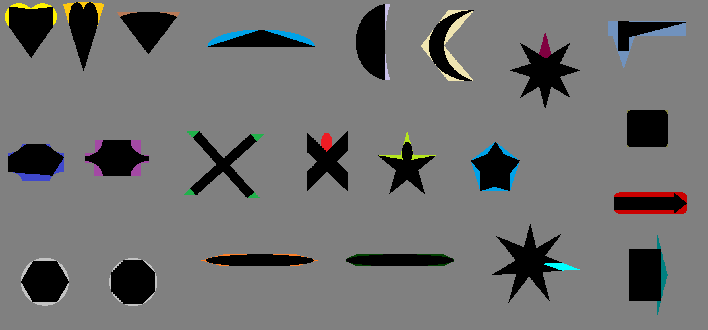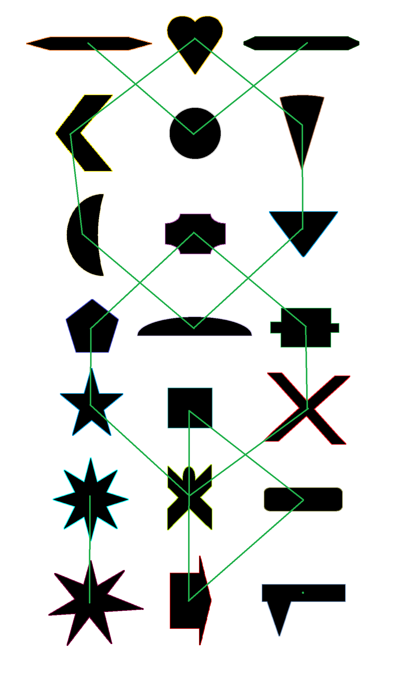 CISRA Puzzle Competition 2012 - Solutions3C. Shape SorterThe title of the puzzle as well as the presentation suggest a popular child's toy known as a "shape sorter". Such a toy consists of a box with various shaped holes in it and a set of prismic shaped objects. In order to get the objects into the box, the child needs to recognise that the shape of the holes matches the shape of the objects, and the each object will only fit in the matching hole. Often the shapes and the outside of the holes have matching colours as well to make things easier for them. Of course, the first thing any "older kid" (a term which stretches all the way to many adults) does is try and outsmart the toy and work out how to jam the shapes into the wrong holes, with a combination of turning them sideways or on awkard angles and the use of excessive force. This puzzle is based around that theme. It can be seen that the colours of the shapes match up to the colours of the "right" holes. Right in the sense that they are a shape with the same name at least. However it's quite clear that the shapes don't fit at all in the "right" holes. Although they are basically the same shape, they're distorted in various ways (mostly by stretching). Incidentally, the colour matching is redundant in that the shapes could be matched to the right holes by name, the colours just confirm that mapping. The trick to the puzzle is to try and get the shapes into the box by sticking them into the "wrong" holes. It can be seen that for the most part each shape will only fit into one of the holes. The following image shows the shapes superimposed over the holes that they fit into (this was the source image from which the puzzle was built). Note the colours are the wrong way around (the shape is black and the hole is the appropriate colour) and this does not include the coloured rings around the holes (which were added later).