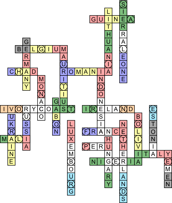 (We have necessarily had to take some small liberties with the colour assignments. In reality, the exact shades of colour used on national flags tend to vary from one another quite a lot. For example, the Netherlands blue is not really as light as Luxembourg's, but neither is it as dark as, say, France's. The Ukraine blue is not even formally defined. To make things practical for the puzzle, the blues have been assigned to one of just two shades in the grid. These necessary shifts should not prevent identification.) Now, taking the circled letters, separated by colour gives: