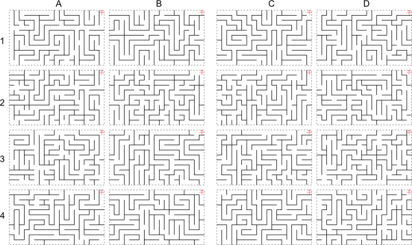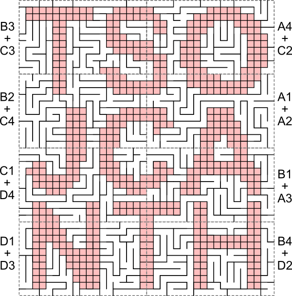 CISRA Puzzle Competition 2012 - Solutions4B. CavernsThis puzzle presents what look like maze pieces, somewhat similar to puzzle 1D Labyrinth, only more of them, more complicated, and without any indication as to how they are meant to be assembled. The secret to assembling the pieces is to overlay them in pairs. When the right pairs are overlaid the patterns of maze walls align exactly over part of the pieces, while in the remainder of the area the walls form a complete grid in which every possible wall position is filled. When all the pieces are so matched into overlaid pairs the resulting patterns can be assembled in jigsaw fashion to form the following:
