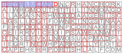The place names formed are (shown hyphenated to indicate the two separate words found in the grid):