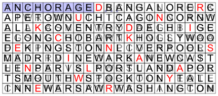 CISRA Puzzle Competition 2012 - Solutions5A. Grid PlanThis puzzle begins as a fairly standard word search, with words to be found horizontally and vertically. It emerges that as more words are found, pairs of words can be combined into place names. Nearly all are cities, as hinted at by the puzzle title, and all are either notable places, or places in Australia. Armed with this insight, the few words that can't be formed into place names can be rejected, and the solved grid can be completed: