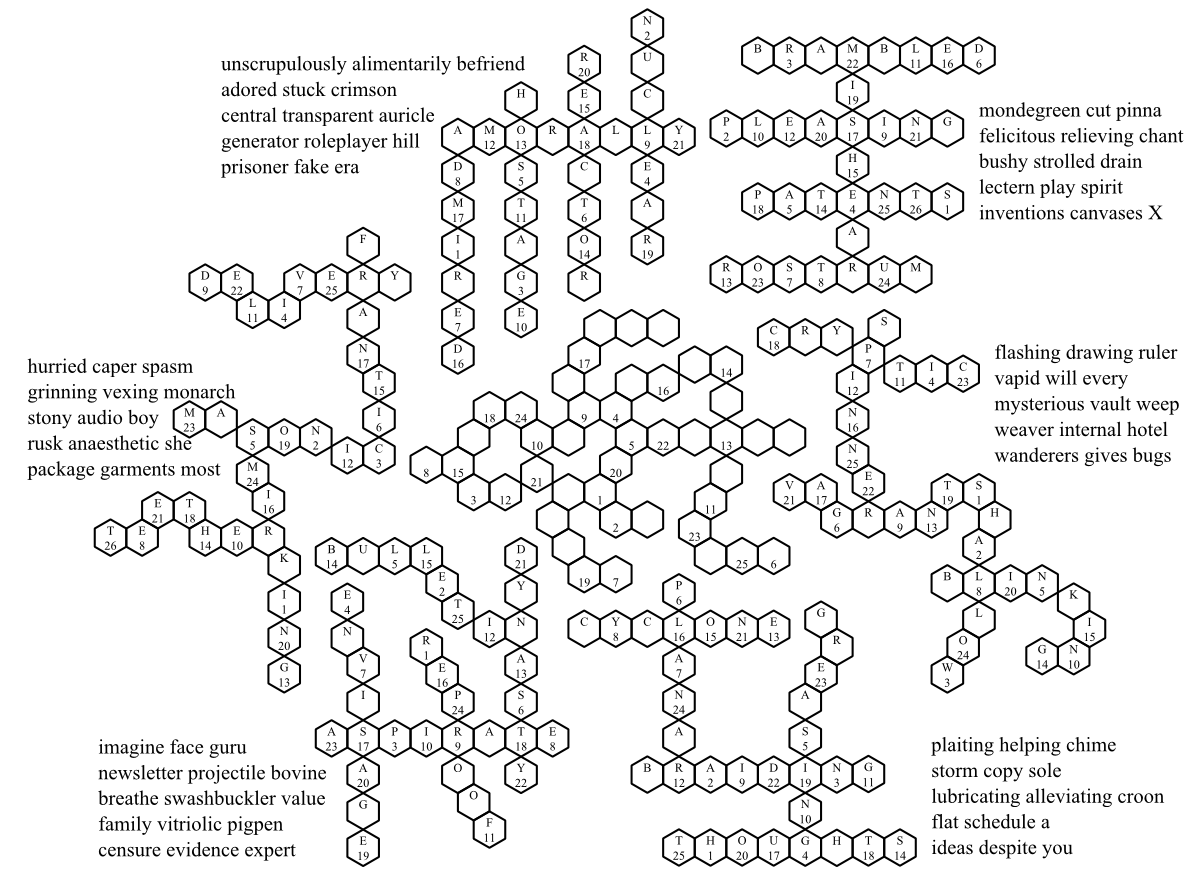 Once the words are determined, they need to be fitted into the nearest set of adjoining hexagons so that the letters interlock properly. When all clues are solved and the hexes in the outer clusters are filled in, it looks like this (click image for a larger version which is easier to read):